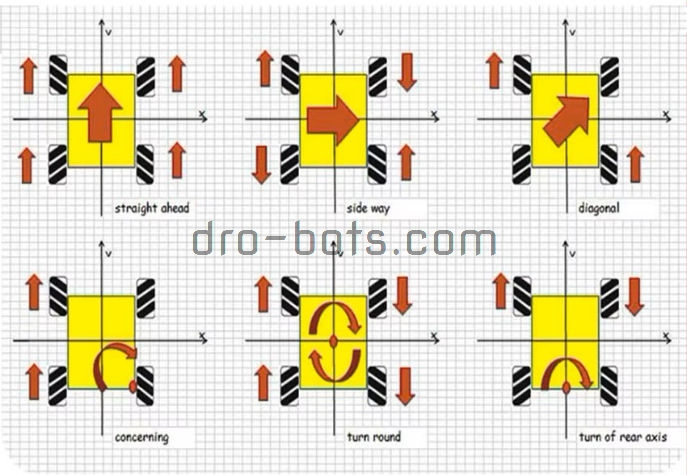 Al alternar ruedas con rodillos para la izquierda y la derecha, de tal manera que cada rueda aplique fuerza aproximadamente en ángulos rectos con respecto a la diagonal de la distancia entre ejes en la que se encuentra la rueda, el vehículo es estable y se puede hacer que se mueva en cualquier dirección y gire variando la velocidad y la dirección de rotación de cada rueda.